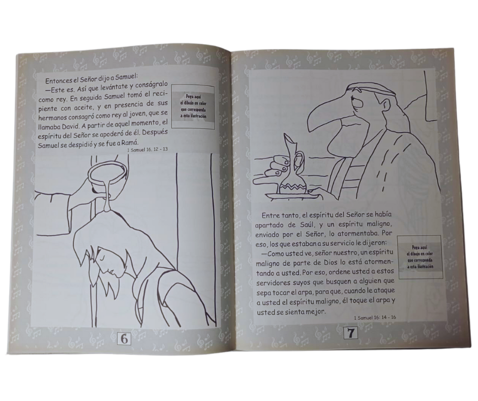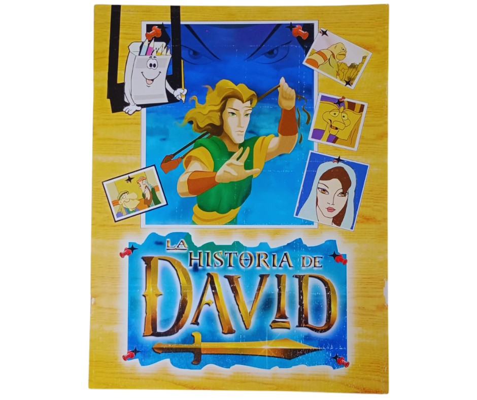 Este libro presenta la historia de David con dibujos para darles color, recortes para poder colocar en cada ilustración, base Bíblica por cada acontecimiento.