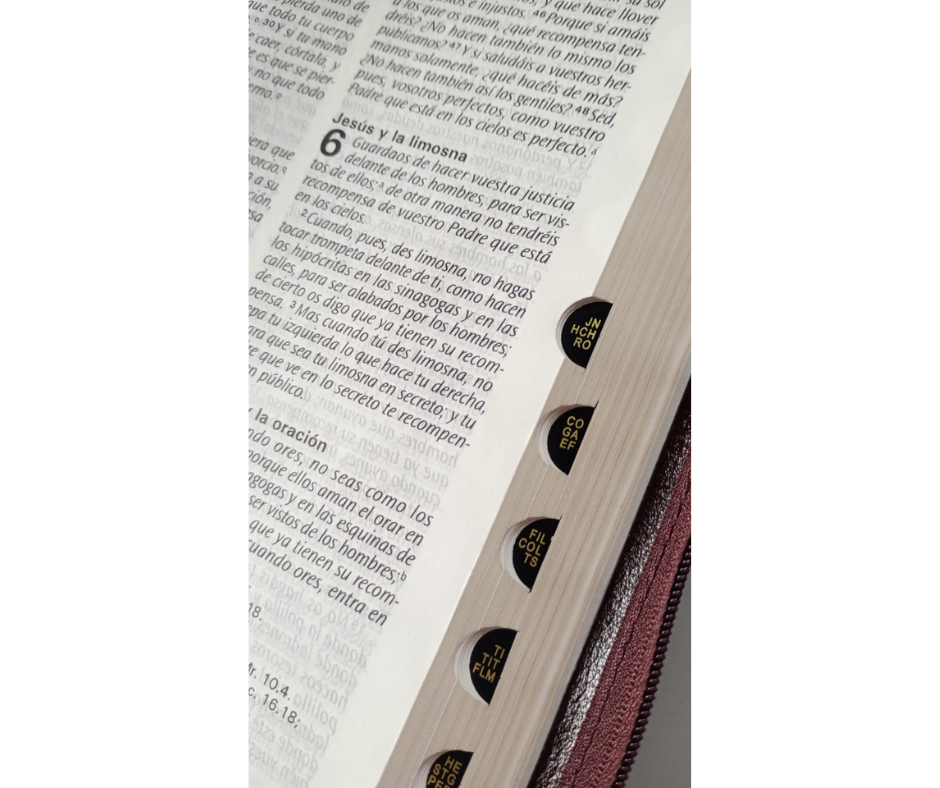 Biblia Reina Valera 1960 con los siguientes elementos: Palabras de Jesús Resaltadas, índice dactilar, introducción a cada libro del Antiguo Testamento, introducción a cada libro del Nuevo Testamento, mapas, cómo leer la Biblia, lectura comprometida, concordancia, referencias y zipper.